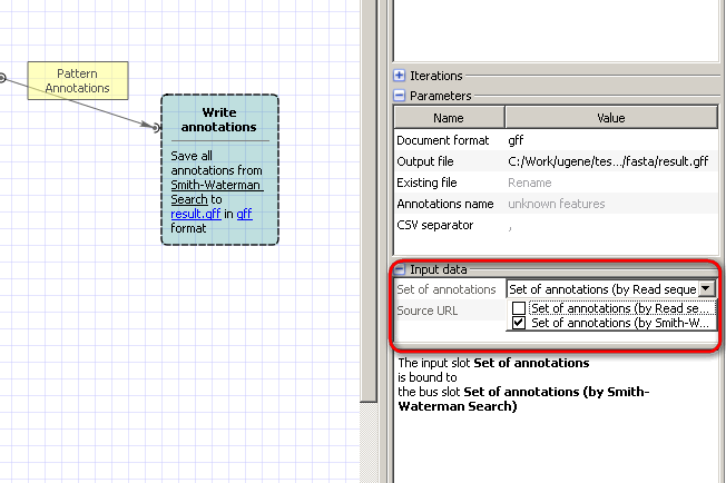Given a file F (in genebank) with an annotated sequence -  A1(annotations 1) and S(sequence). You read the file, perform some calculation on S (using Smith Waterman for instance) that produces annotation A2. If you want to write the result in the file F you just need to use the "Write sequence" element ("overwrite" option). The file F will contain the annotated sequence - A1, A2 and S. Annotations are already attached to its sequence in the context of Workflow Designer and you don't need to connect them manually  using "Write annotations".