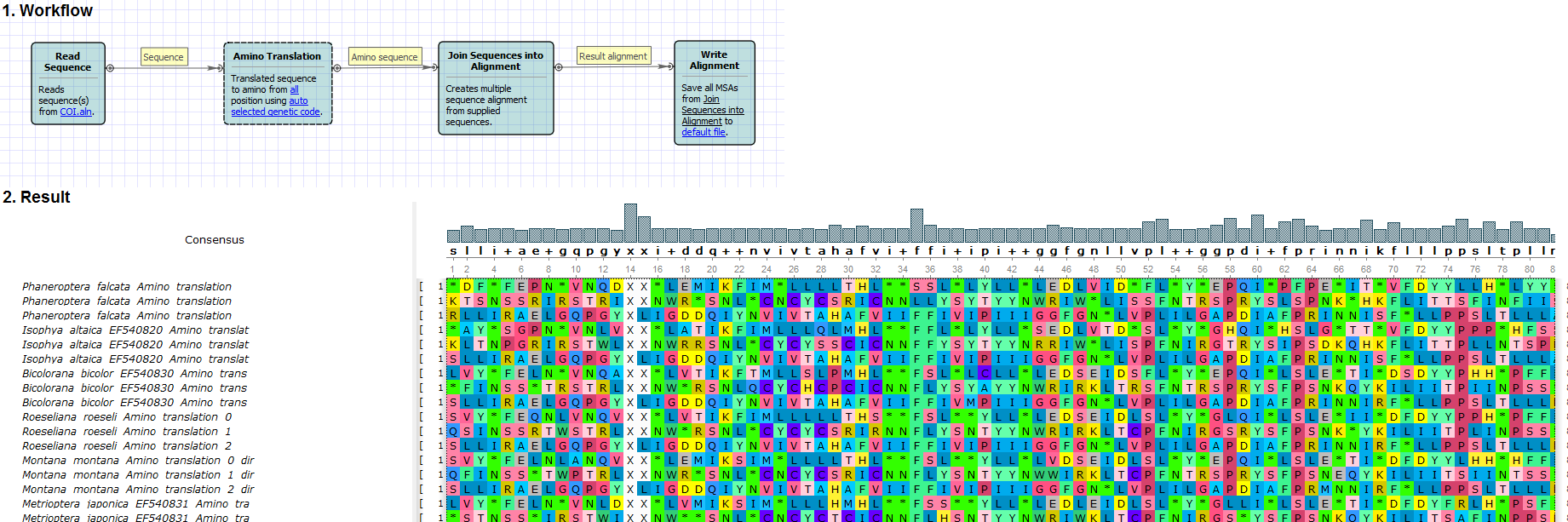 I created a workflow to compared amino acids translation in the reading frame of interest. I did this for 5 sequences for now to make me the hand on ugene but i'll compare more than 4 000 sequences.
