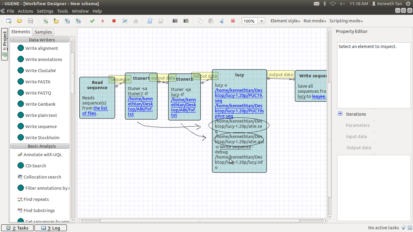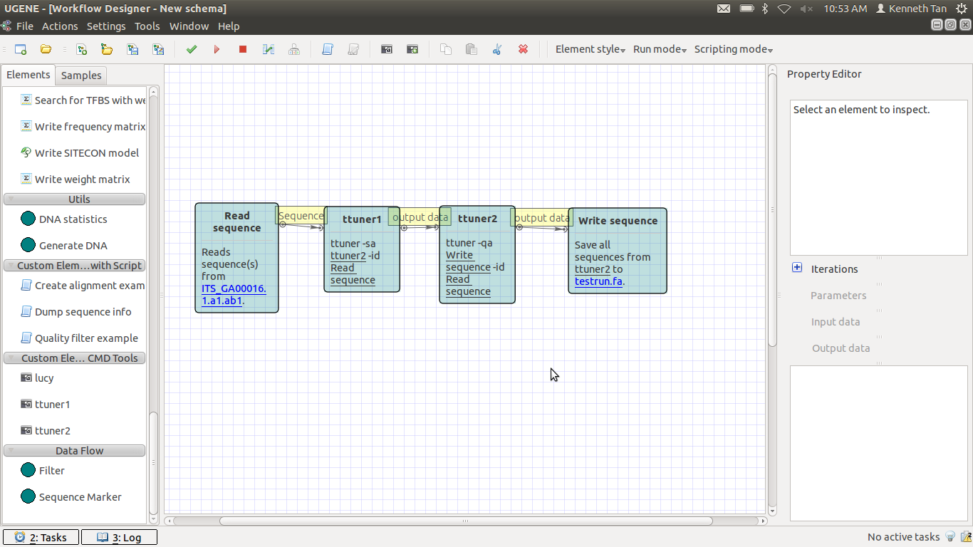 1) First of all, I should tell about the second schema. As I can see, your execution string is "ttuner -sa $seq -id $in". The ttuner cmdline key "-id" means that you put a directory to the input. But the "Read sequence" element reads files, and only sequence data will be available in the output port, but not any directories.